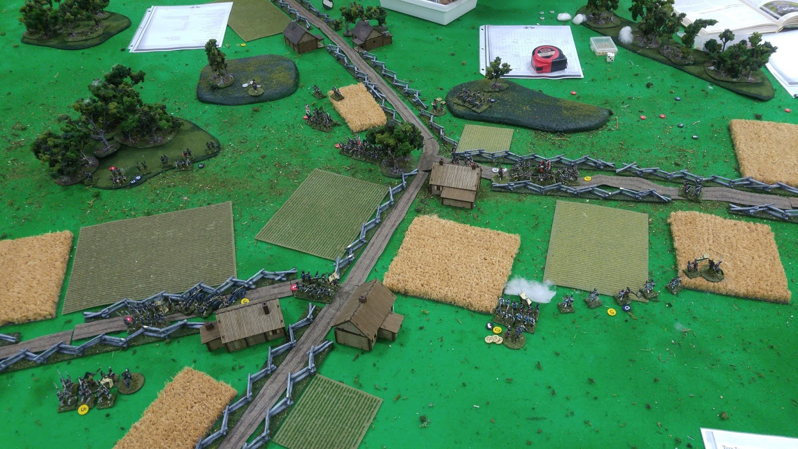 We used a set rules called Land of the Free. Let me start out be saying that I'm not really a fan of what I've seen in these rules. Maybe we made some fundamental mistakes but it seems like units can do a lot of things in a turn, like shoot three times. Now I'll concede that I had really crappy die rolling (I think I only passed morale checks for the artillery all game) and that definitely played a role in how I view these rules. I do think a game should be able to compactly summarize itself into 2-4 quick reference pages. For some reason, these rules use 6 pages and there's no reason they shouldn't have been on 4.